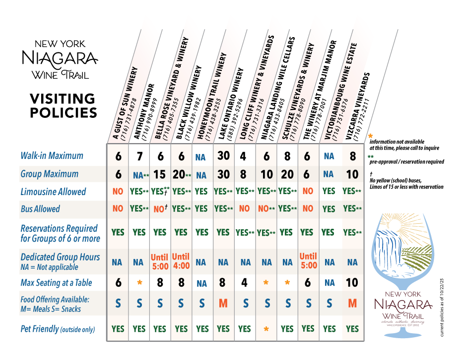 All visiting patrons and groups should review the Visiting Policy chart below and contact the individual wineries for more details and guidelines.