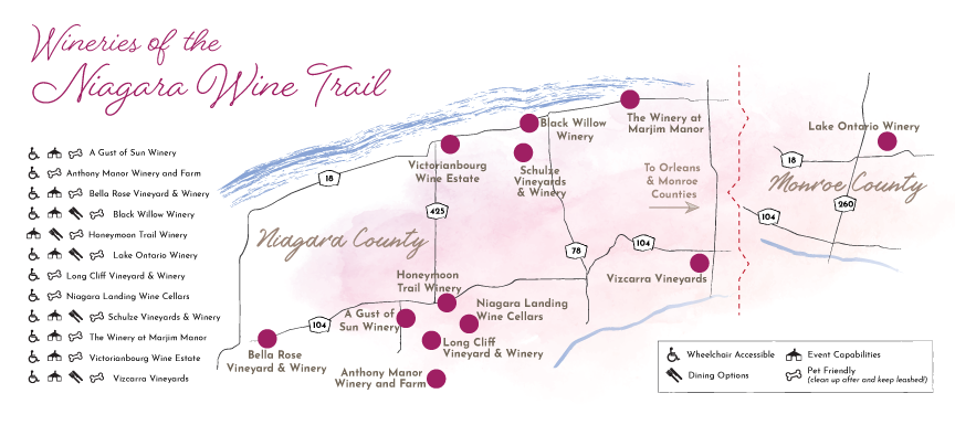 Winery locations are throughout Niagara and Monroe counties (not to scale)